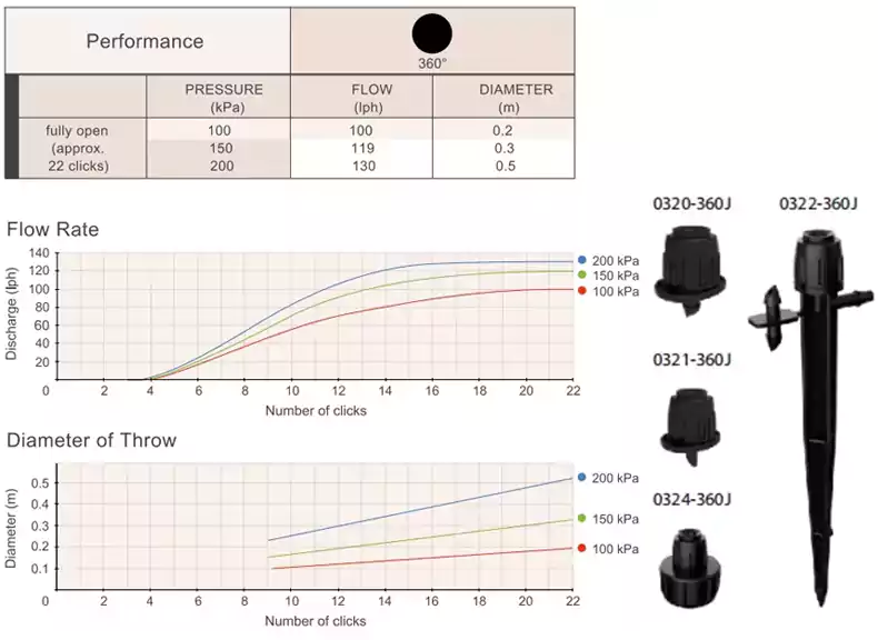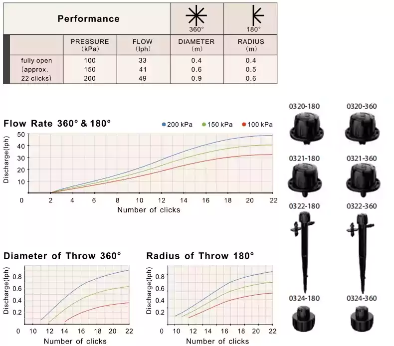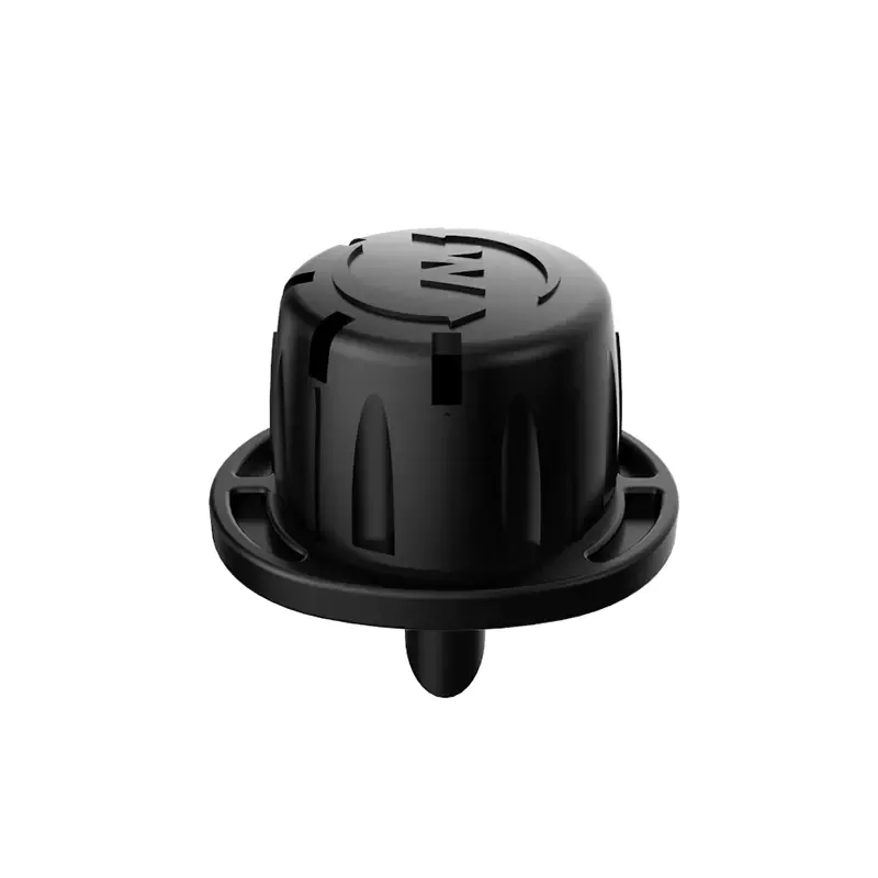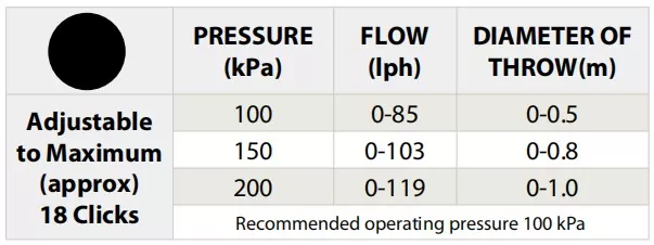 Obrót nakrętki Mini Bubbla pozwala na jednoczesną regulację natężenia wypływu i średnicy wyrzutu. Ten opryskiwacz Twista o regulowanym przepływie zapewnia jednolity wzór parasolowy, który delikatnie rozprowadza wodę w strefie korzeni rośliny.