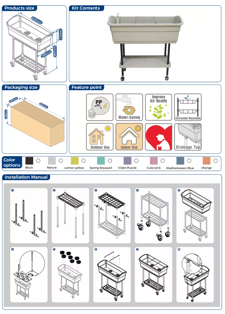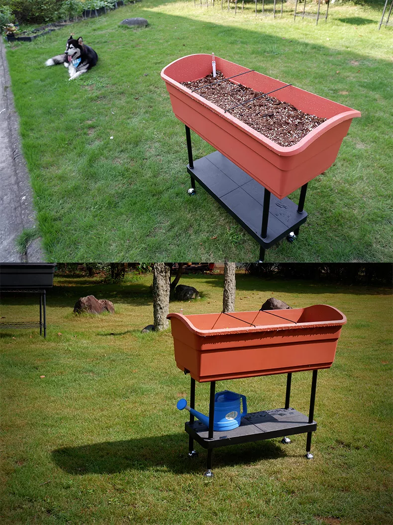 Mobilne łóżko ogrodowe z podwyższeniem jest zgodne z zasadami ergonomii, szczególnie dbając o osoby starsze, które mają trudności z kucaniem ze względu na problemy z poruszaniem się. Dzięki jednowarstwowej konstrukcji stojaka do przechowywania może przechowywać wszelkiego rodzaju narzędzia i akcesoria potrzebne do uprawy kwiatów i roślin. Wyposażony jest w uniwersalne koła, co ułatwia jego przemieszczanie zarówno w środowisku wewnętrznym, jak i zewnętrznym. Z powodzeniem może zaspokoić potrzeby mieszkańców miast, którzy uwielbiają sadzenie. Zapewnia doskonałe środowisko do uprawy roślin i pomaga w łatwy sposób stworzyć własny, ekologiczny, zielony i zdrowy styl życia.