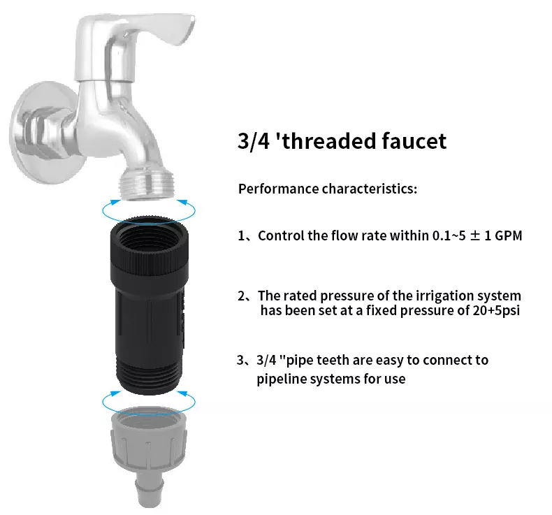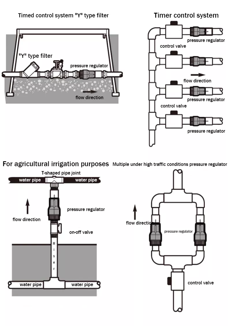 Regulator ciśnienia nadaje się do wewnętrznych i zewnętrznych systemów nawadniających 13 mm/19 mm/25 mm, jego podstawową funkcją jest stabilizacja ciśnienia i przepływu wody poprzez regulację różnych ciśnień wlotowych, zapewniając stałą wydajność dla nawadniania kropelkowego w punktach końcowych, systemów tryskaczowych i innych zastosowań związanych z nawadnianiem o niskim przepływie. Jest kompatybilny ze wszystkimi typami nawadniania kroplowego, systemami o niskim przepływie i mobilnymi zraszaczami, dzięki czemu idealnie nadaje się do oszczędzających wodę konfiguracji nawadniania.
