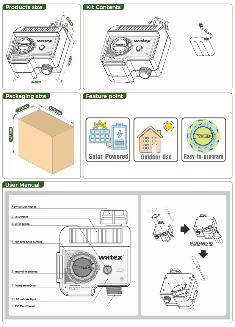 W porównaniu z podobnymi produktami, timer zasilany energią słoneczną nie wymaga częstej wymiany baterii (w normalnych warunkach użytkowania). Jest przyjazny dla środowiska i energooszczędny. Ma wystarczającą moc i jest trwały, dzięki czemu jest urządzeniem do podlewania, dzięki któremu możesz spokojnie podróżować służbowo.
