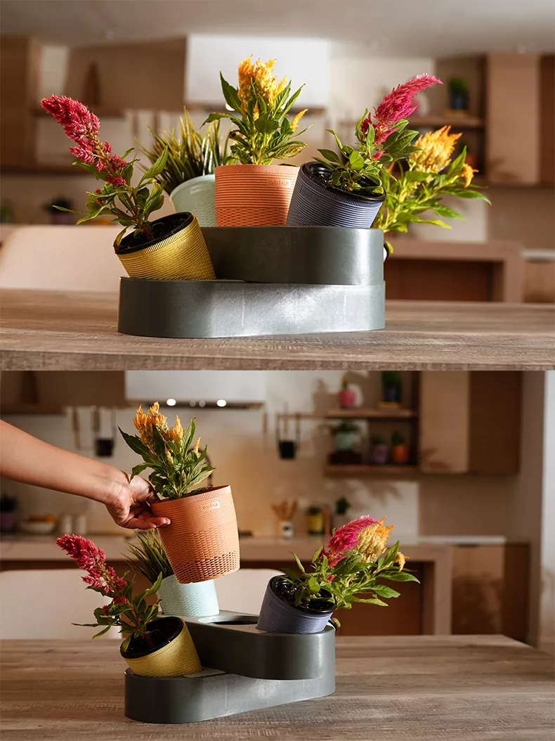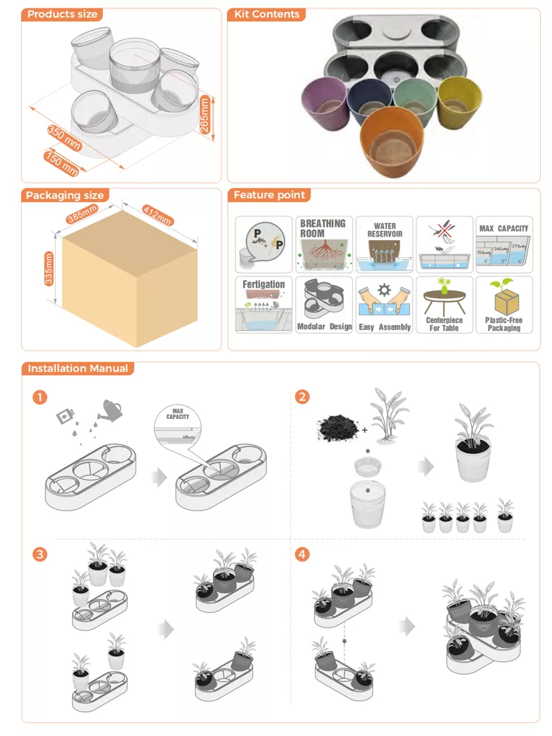 Doniczki nadają się do dekoracji wnętrz. Można w nich posadzić ulubione rośliny zielone lub warzywa. Podlewanie jest bardzo wygodne. Wystarczy dodać wodę lub roztwór składników odżywczych do bazy magazynującej wodę. Dno doniczki jest wydrążone, co pozwala lepiej wchłaniać wodę.