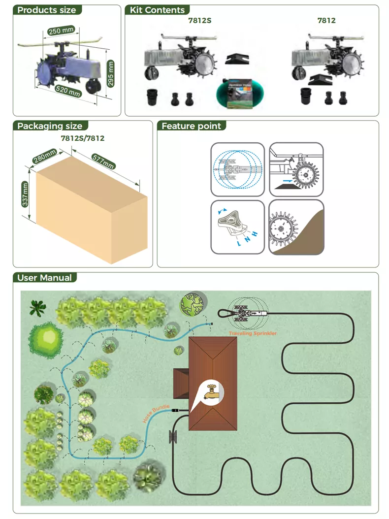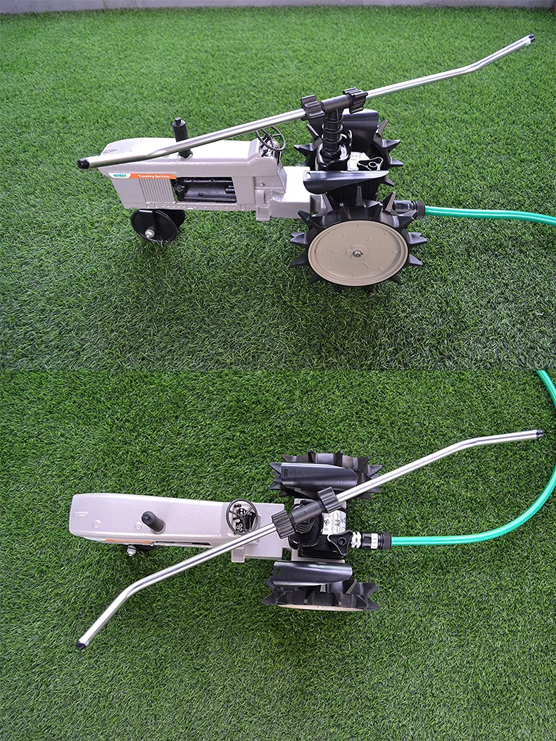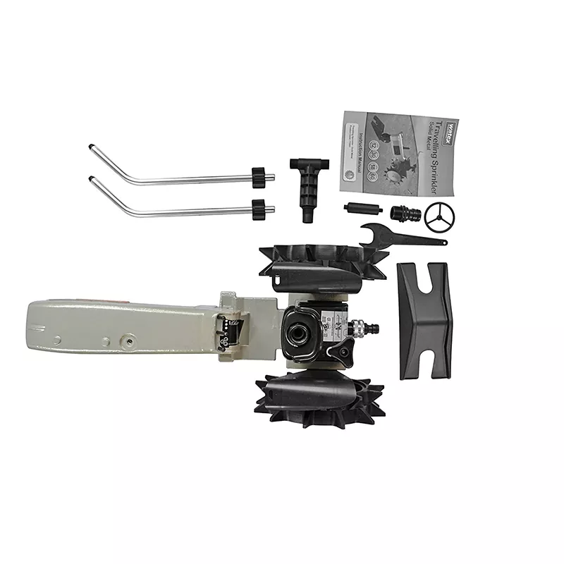 Zraszacz nawadniający Travelling Sprinkler, zasilany ciśnieniem wody z kranu, podąża ścieżką wyznaczoną przez istniejący wąż ogrodowy do podlewania. Po zakończeniu automatycznie zatrzymuje się w zaprogramowanych pozycjach, co czyni go idealnym partnerem do nawadniania rozległych trawników lub pasów zieleni. Wytrzymały żeliwny korpus pokryty farbą do stosowania na zewnątrz zapewnia trwałość i wytrzymałość. W pełni zautomatyzowany, co umożliwia obsługę bez użycia rąk, łatwą, wygodną i ekologiczną.